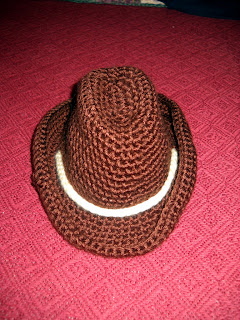 The first hat came into existence from a Custom Request--LOVE IT-- by a lady who had purchased quite a few items from my shop. One of the items was a pair of cowboy booties and she asked if I could make a Cowboy hat to match.